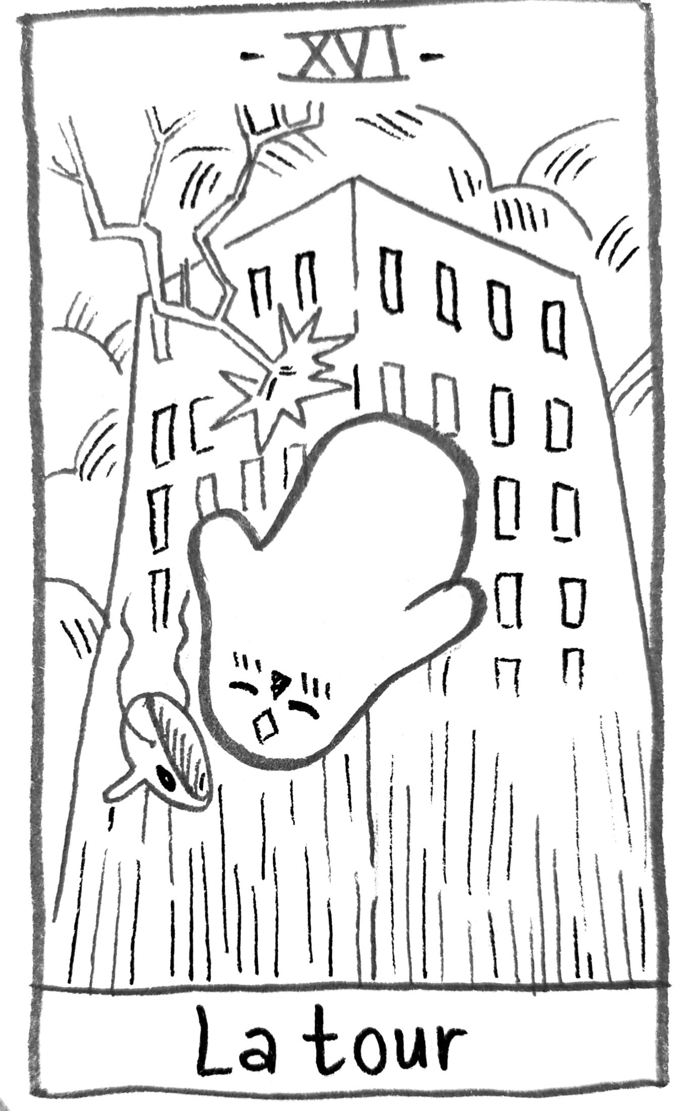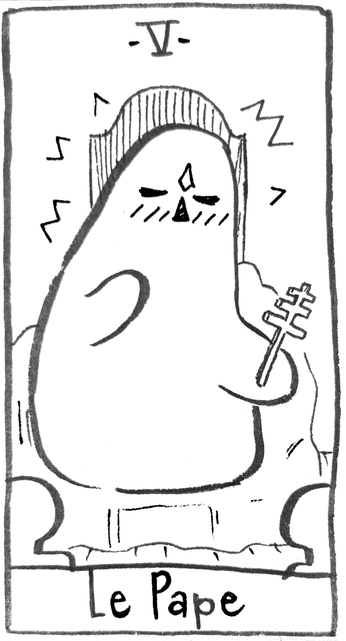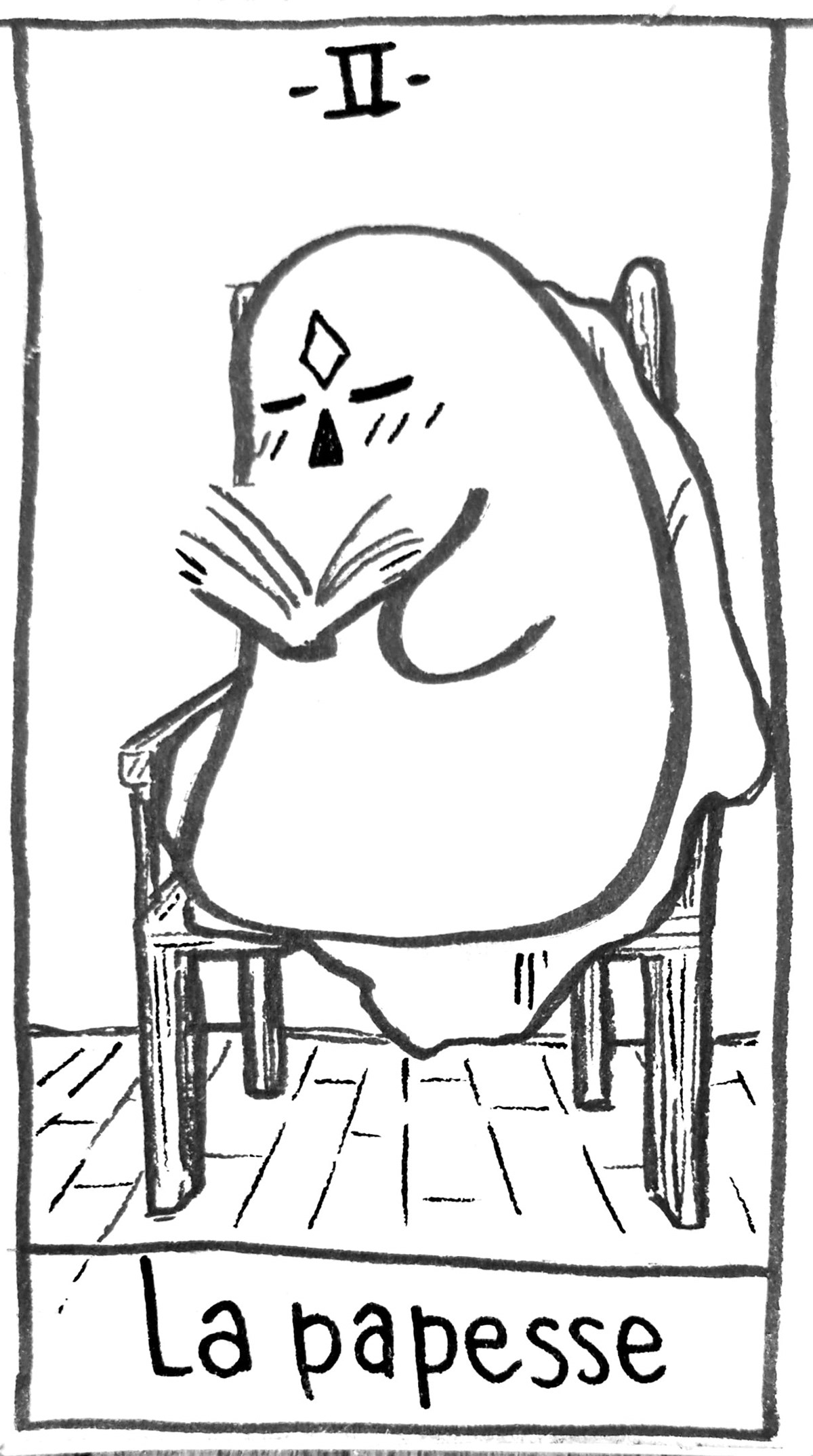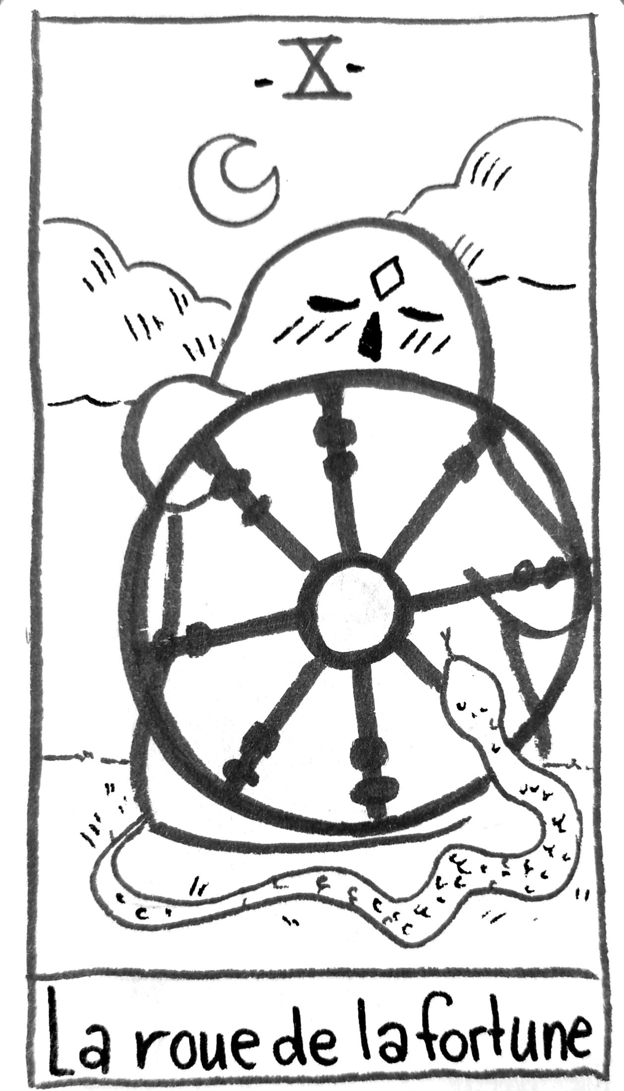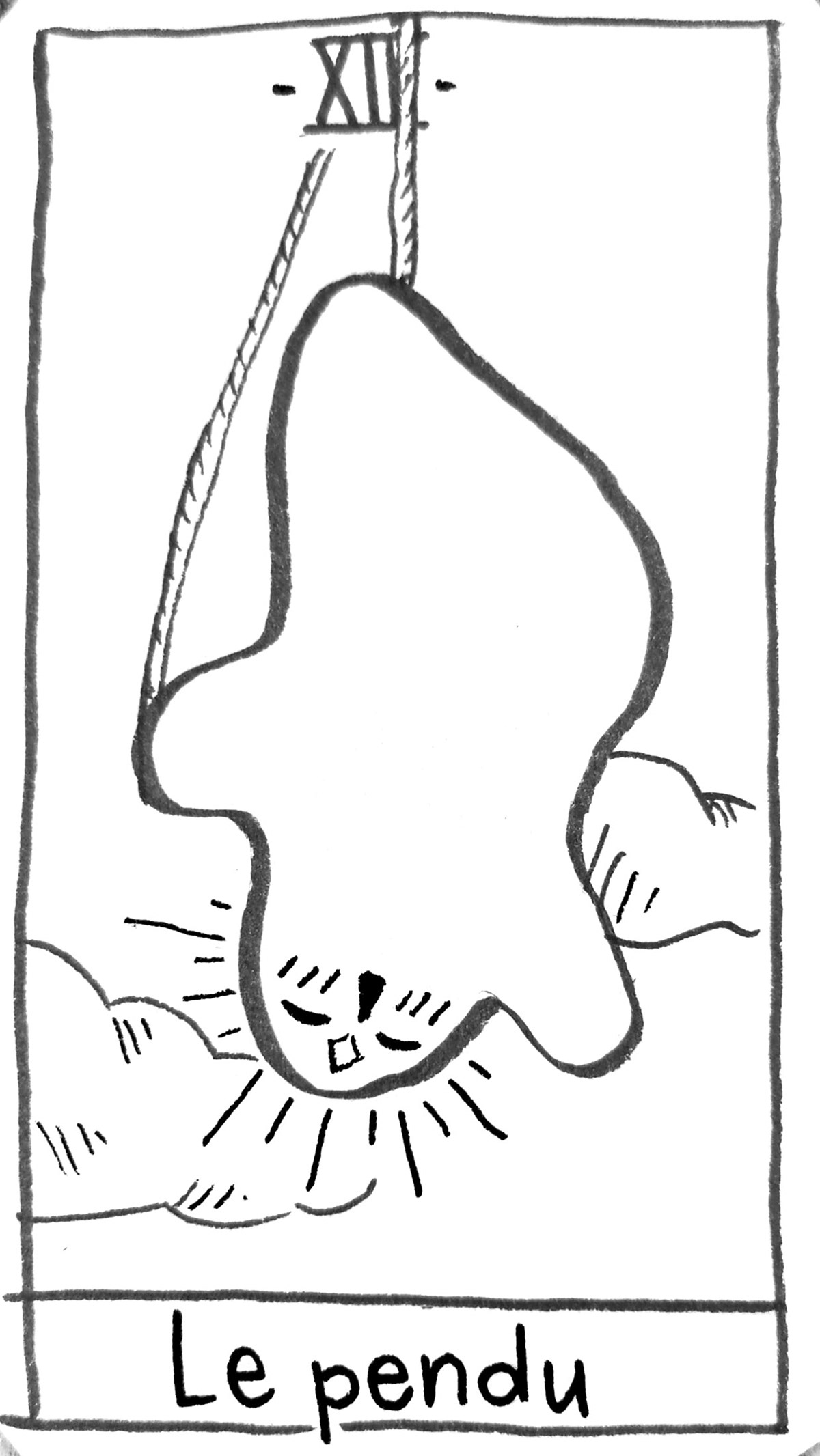Cet autoportrait me représente dans la pose de la vierge Marie, entourée de fleurs dans le style art nouveau et de carte de tarot montrant ma personnalité. Peinture à l'aquarelle, détails et cartes à l'encre de Chine.