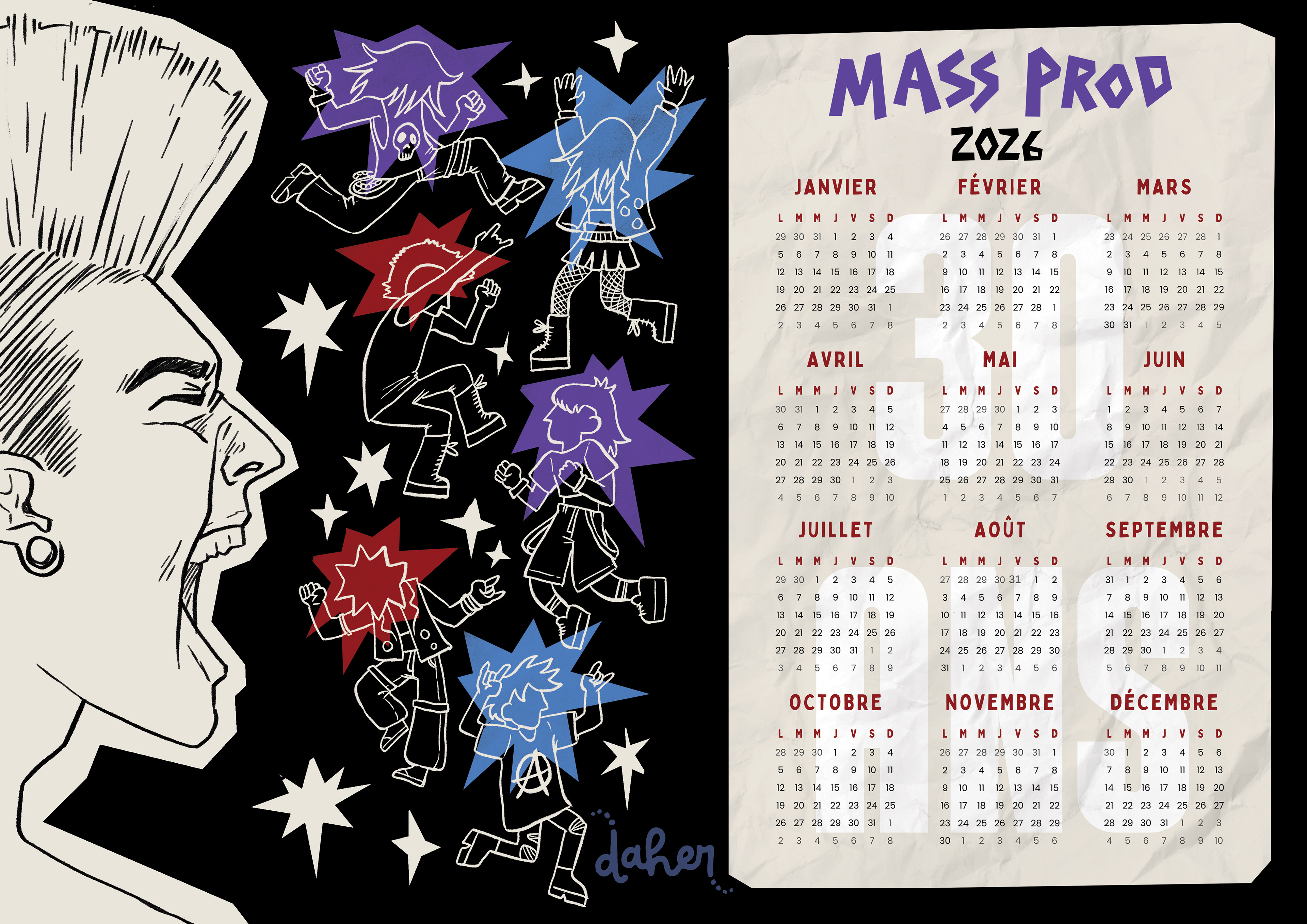Illustration et mise en page du calendrier annuel de l'association Mass Production et de badges vendus lors des événements.